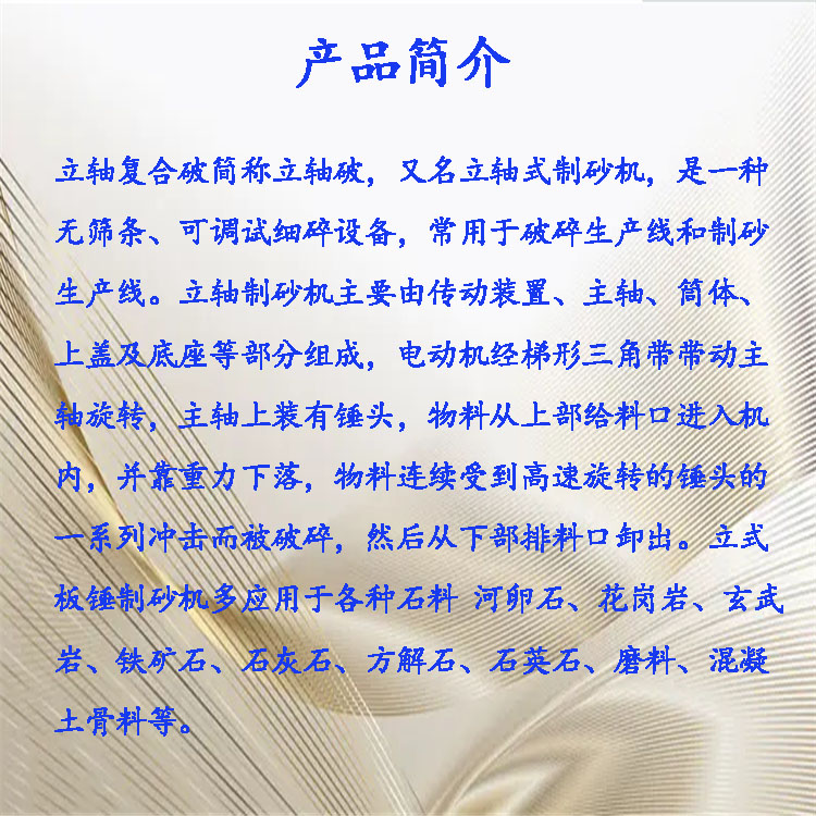 【给料粒度】:<100mm 【出料粒度】:5mm以下 【生产能力】:150-200t/h 【适用物料】石灰石、花岗岩、玄武岩、辉绿岩、石灰岩、煤矸石 、矿石尾矿、建筑垃圾等。