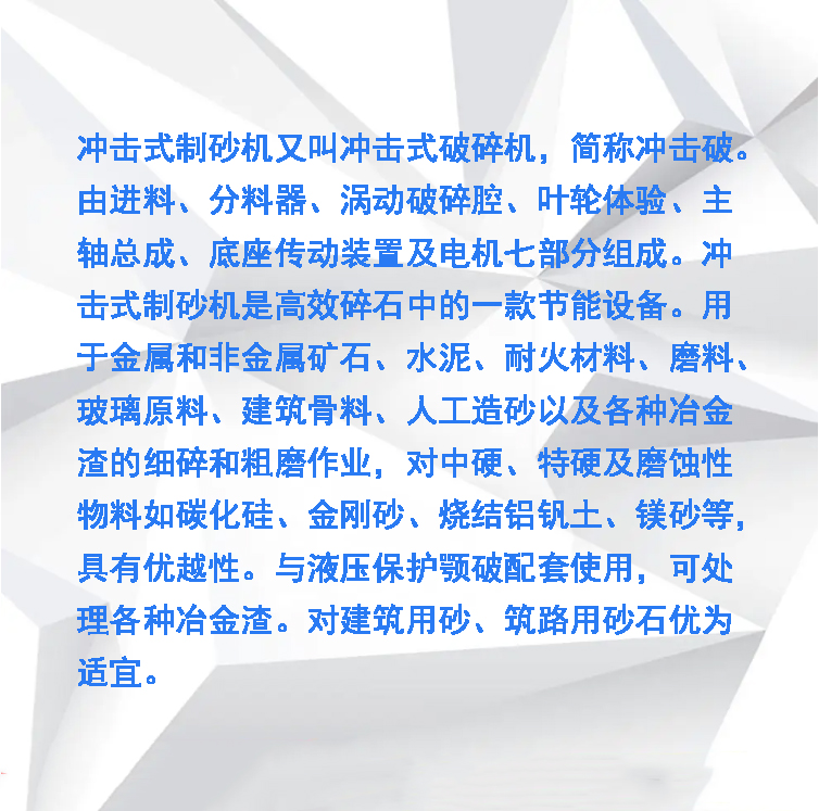 【进料粒度】:≤60mm 【生产能力】:12-650t/h 【处理物料】:河卵石、石灰石、石英石、花岗岩、煤矸石、混凝土骨料等。