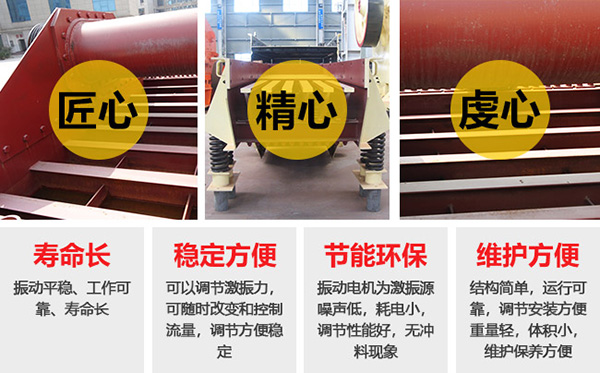 电动机经三角带使激振器偏心块产生高速旋转。运转的偏心块产生很大的离心力,激发筛箱产生一定振幅的圆运动,筛上物料在倾斜的筛面上受到筛箱传给的冲量而产生连续的抛掷运动,物料与筛面相遇的过程中使小于筛孔的颗粒透筛,从而实现分级。